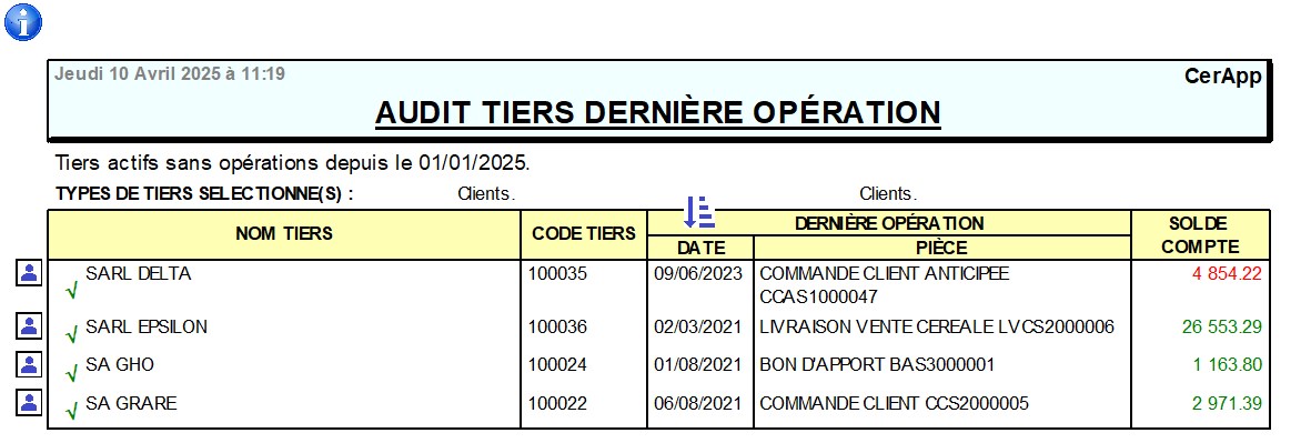 - Audit Dernière opération : Tiers sans opération depuis la date sélectionnée