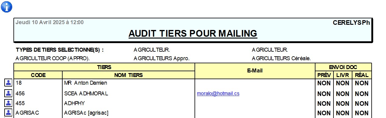 - Mailing pour l'activité : Tiers pour lesquel le paramétrage d'envoi des documents par email n'est pas coché.