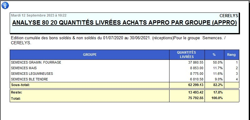- Analyse 80/20 = Indication des cumuls quantitatifs : selon la loi de Pareto, 80 % des livraisons achats est réalisé par 20 % des fournisseurs.