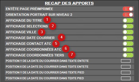 | Avec détail des dépôts | Visible si Modèle 1 sélectionné. Possibilité d'afficher/supprimer le détail des dépôts via un lien interactif dans l'édition. Si coché : Affiche la répartition des apports en dépôt en 3 sous-colonnes : Dépôt, Aliment, Reprise |