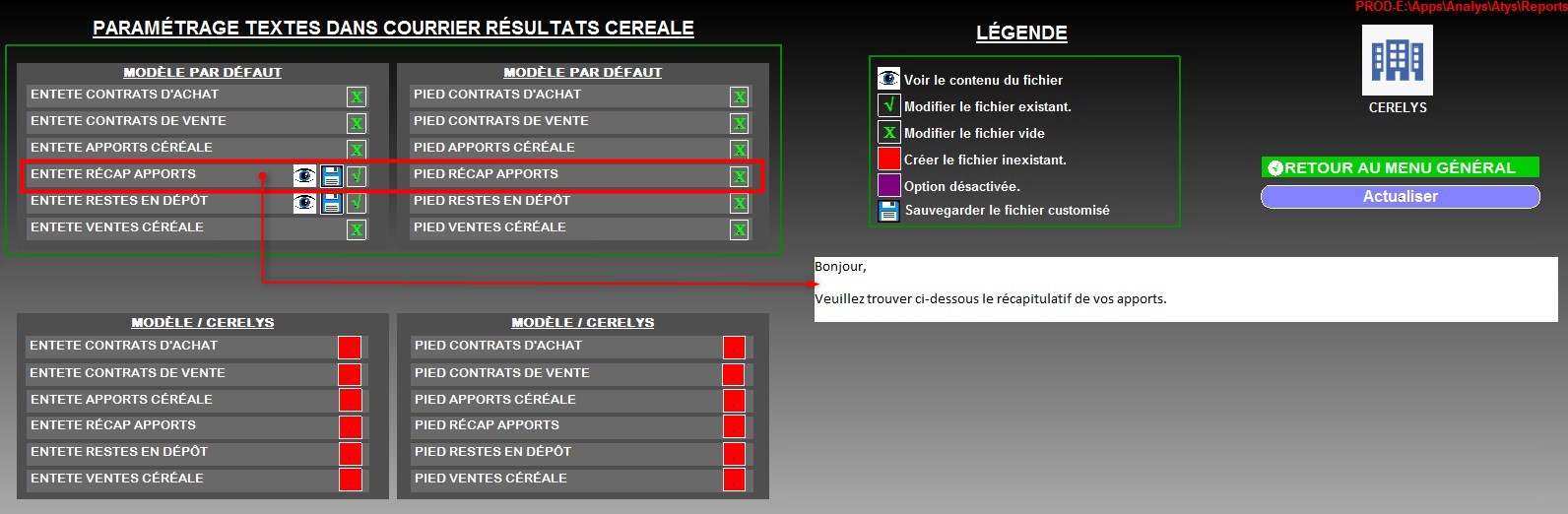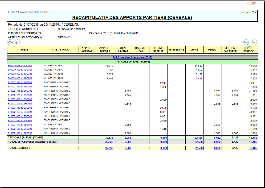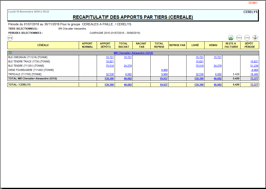 | Céréale | Filtre d'un ou plusieurs articles. Si aucun article n'est sélectionné, alors il y aura la possibilité de sélectionner un groupe article après validation de la fenêtre de paramètres. |