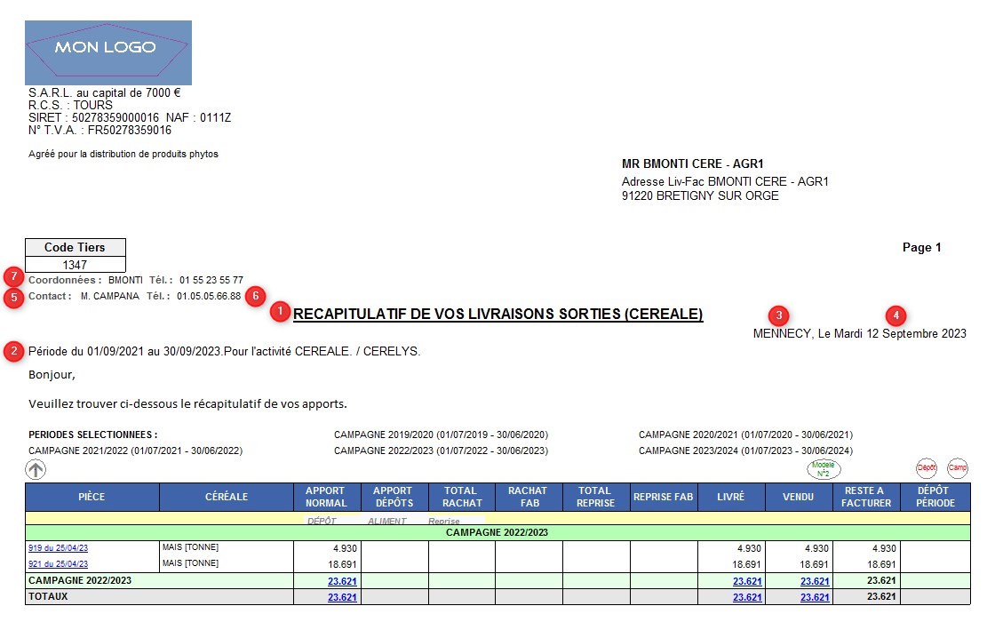 - Modèle N°1 : Les parts Livrées, vendues sont visibles et le stock période est présenté en dernière colonne.
