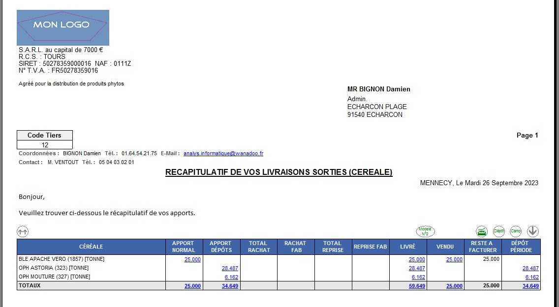 | Tri par | ATC, ATC principal, Céréale, Code onic, Périodicité, Entité, Groupe, Tiers, Tiers modèle courrier (voir exemple d'édition) , Type tiers, … |