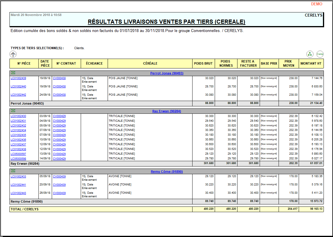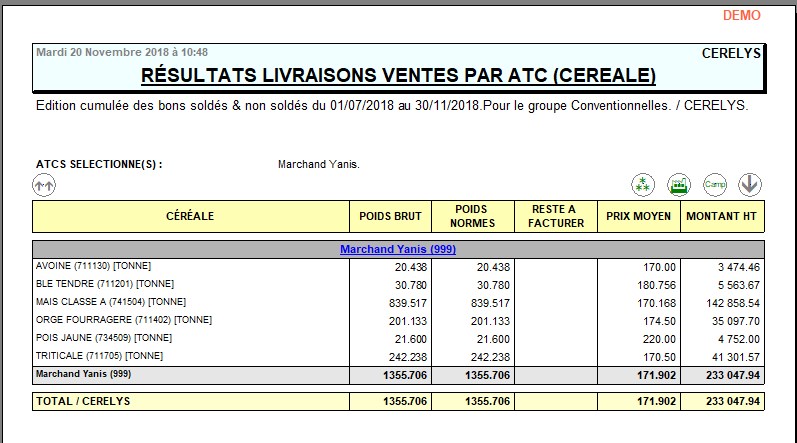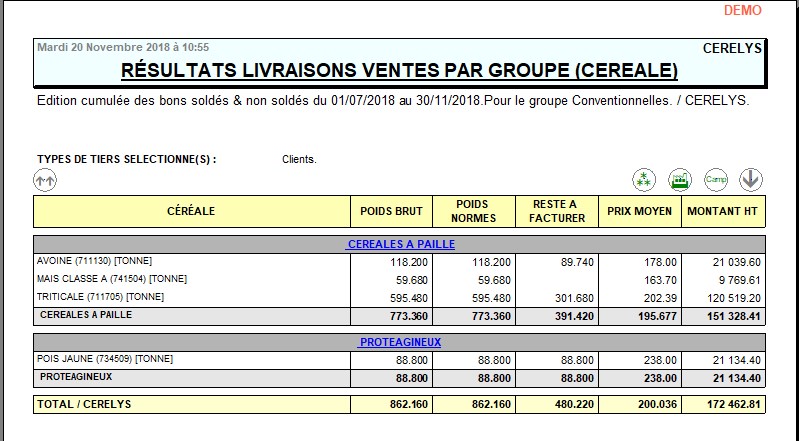 | Céréale | Filtre d'un ou plusieurs articles. Si aucun article n'est sélectionné, alors il y aura la possibilité de sélectionner un groupe article après validation de la fenêtre de paramètres. | Tous |
