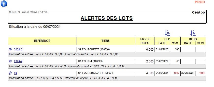 Index -> Traçabilité Appro -> Alertes des lots