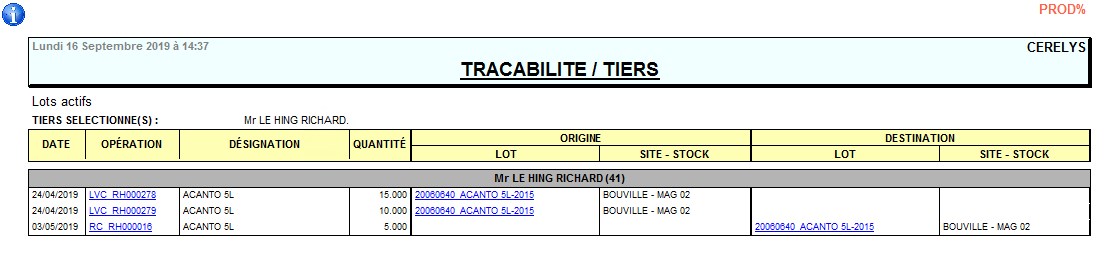 Permet de connaitre l'historique de tous les lots d'un fournisseur. Les opérations sont triées chronologiquement.