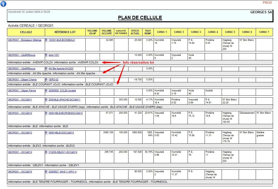 Description du contenu des cellules : Volume, capacité, stock actuel, caractéristiques moyennes du ou des lots présents.