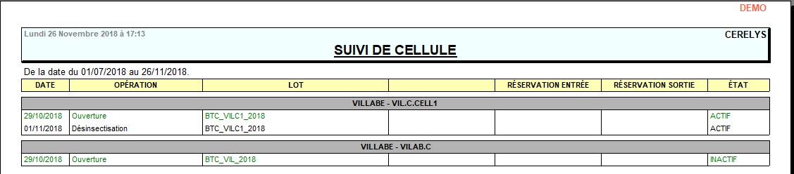 Visualisation des lots contenus dans la cellule et des informations de réservation Entrées sorties.