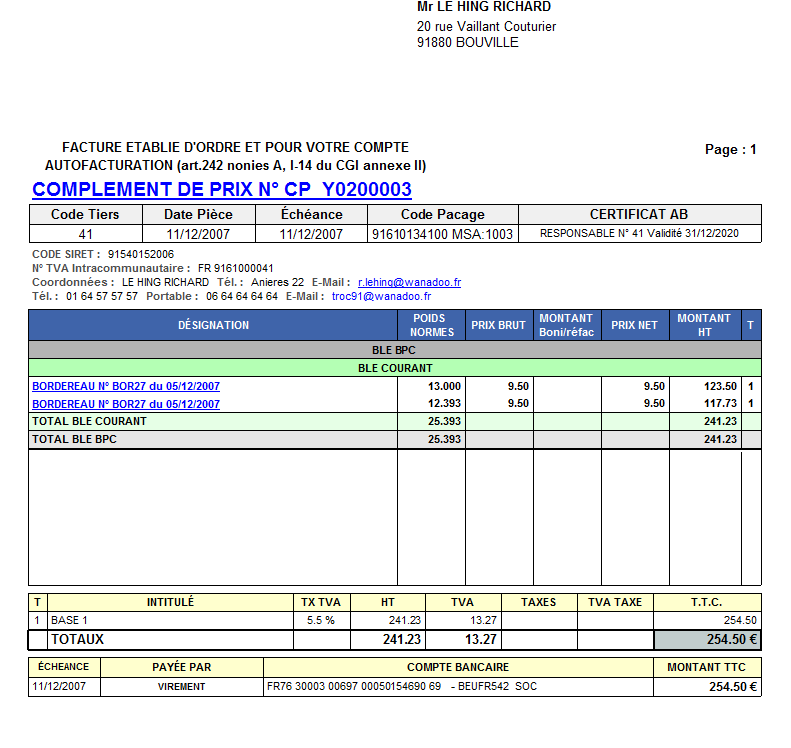#3238 - BORDEREAU D'APPORT - BORDEREAU DE COMPLEMENT DE PRIX : Edition du N° SIRET et du N° PACAGE.