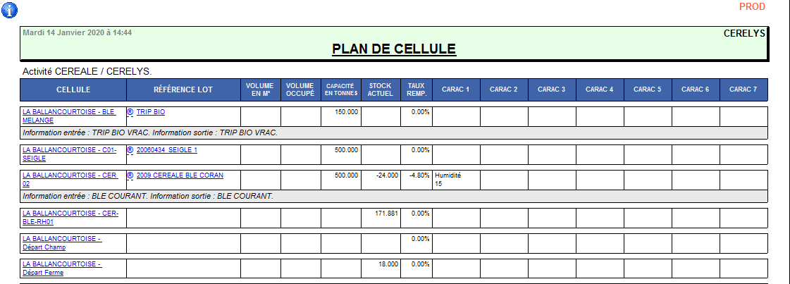 L'état présente uniquement les cellules qui ont un lot d'affecté. On ne voit donc pas les cellules disponibles ou réservés mais sans lot.