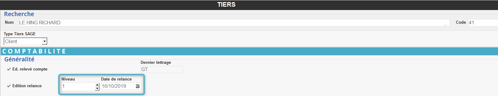 - Le niveau de relance et la date de la dernière relance sont visibles dans la fiche du tiers, dans la section “COMPTABILITÉ”.