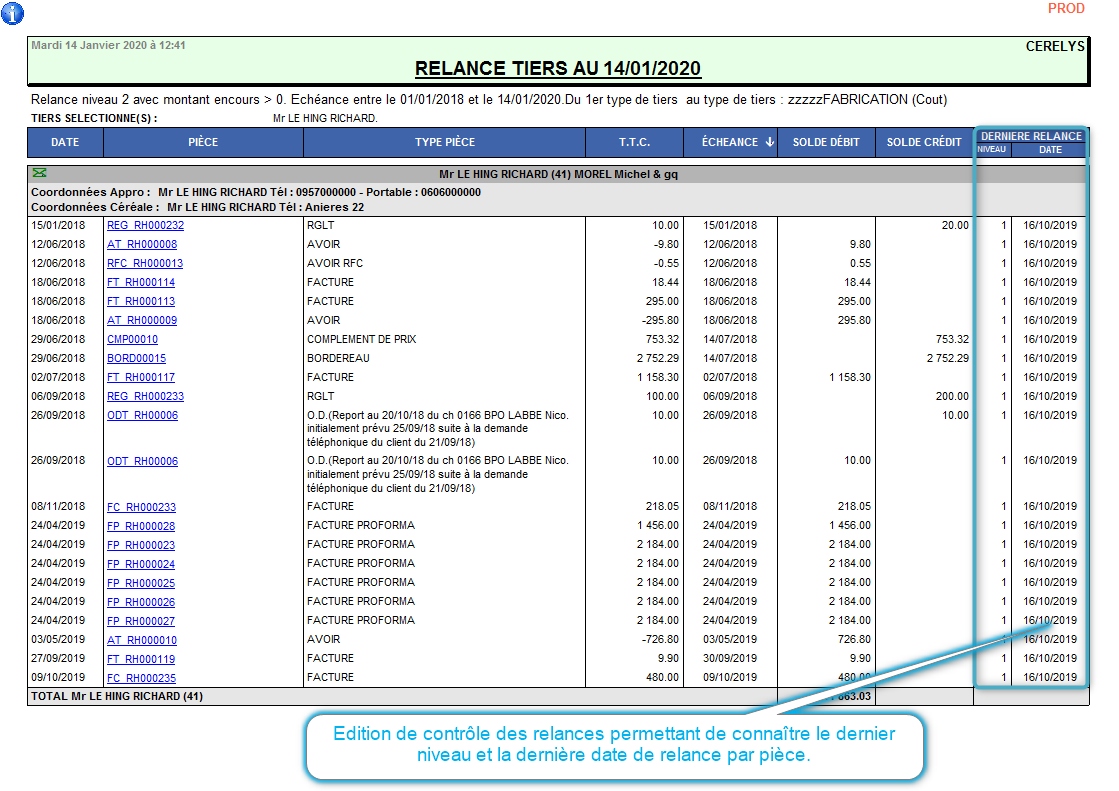 - Possibilité d'éditer les relances sous forme d'une liste de contrôle avec le dernier niveau et dernière date de relance par pièce.