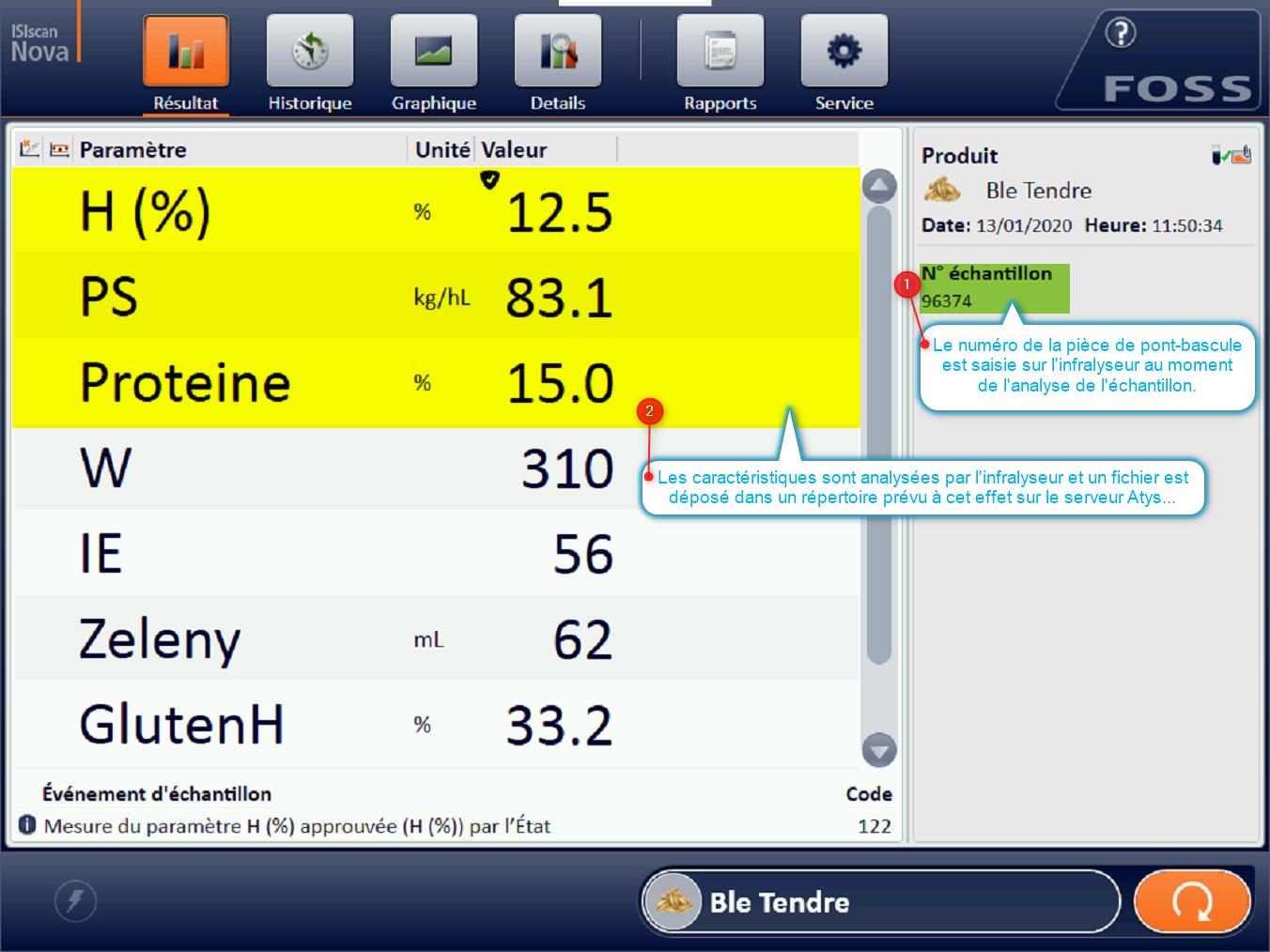 Les caractéristiques analysées par l'infralyseur (Humidité, P.S., Protéïne, …) sont alors récupérées en automatique lors de la saisie au pont bascule ⇒ Plus de rapidité et de fiabilité dans vos saisies pont bascule !