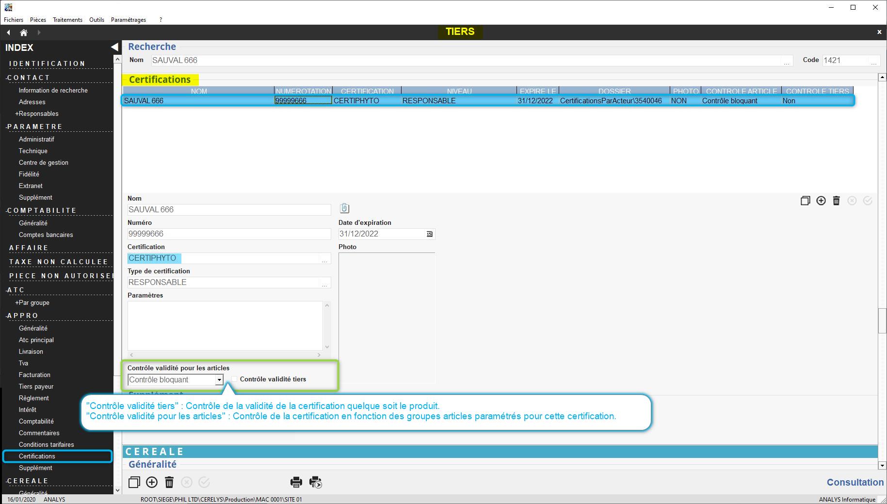 On peut créer des certifications et on peut les rattacher aux tiers. Par contre, on ne peut pas paramétrer un contrôle bloquant ou avertissant pour ces différentes certifications.