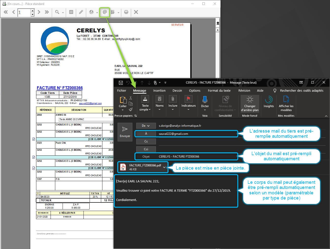Le pdf de la pièce est automatiquement attaché en pièce jointe, l'objet du mail est pré-rédigé et le corps du mail peut-êre également pré-rédigé (possiblement en fonction du type de pièce).