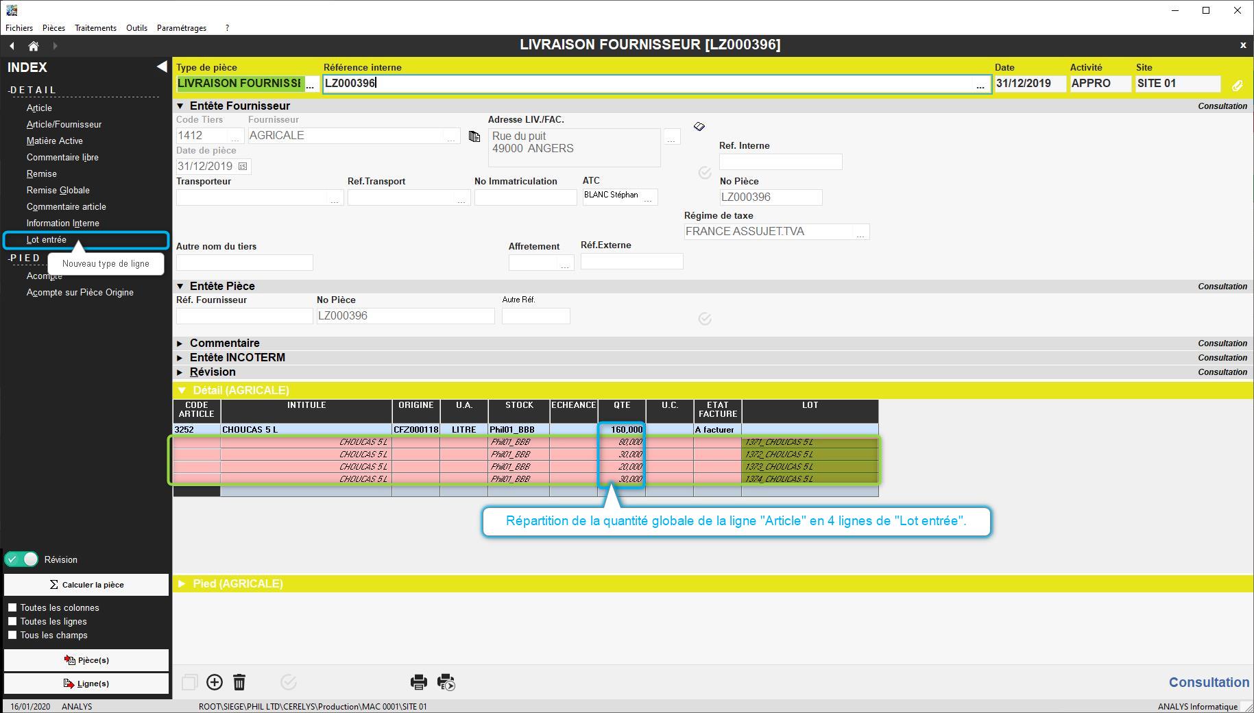 Actuellement, si une livraison concerne un produit avec plusieurs lots, on doit saisir autant de lignes article qu'il y a de lots. Il faut pouvoir affecter plusieurs lots à une ligne article.