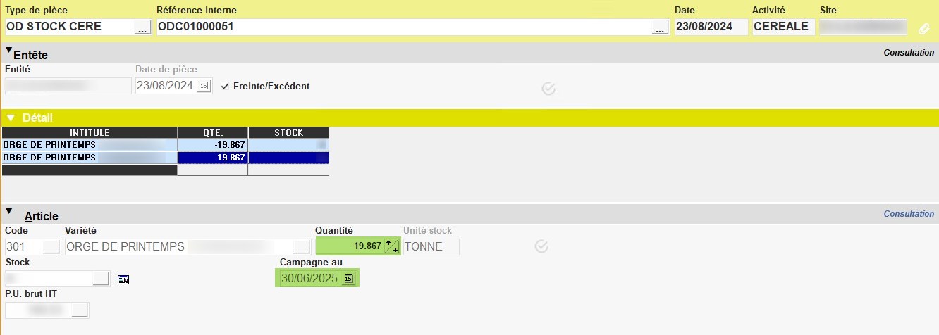 Basculement du stock d'une campagne vers une autre :Par exemple, lorsqu’il reste des stocks physiques céréale sur une campagne achevée, et qu’il n’y a plus de dépôt, il est alors possible de réaffecter ce stock sur une campagne récente ou en cours.